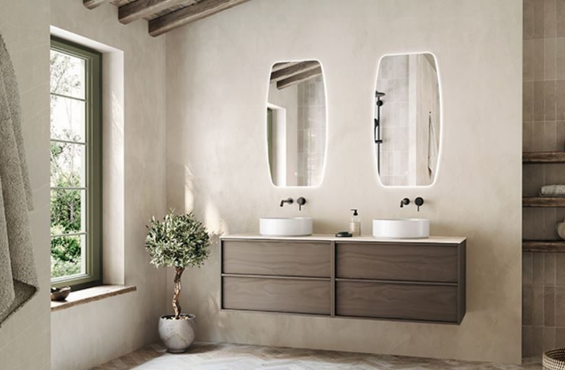 In de badkamer vertaalt dat zich naar een rustige, natuurlijke sfeer met warme houttinten, matte tegels, zachte kleuren en pure materialen zoals steen, hout en betonlook.