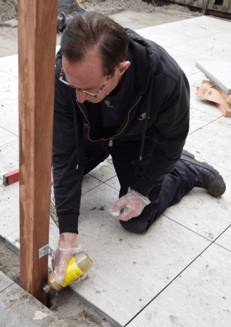Het proces is verrassend simpel. In plaats van een groot gat te graven en beton te storten, boor je met een grondboor een relatief klein gat. Daarna meng je de twee componenten, giet je het mengsel rondom de paal en laat je het schuim uitzetten. Binnen 20 minuten is de paal belastbaar en na ongeveer 2 uur volledig uitgehard.