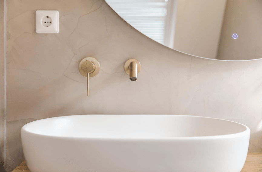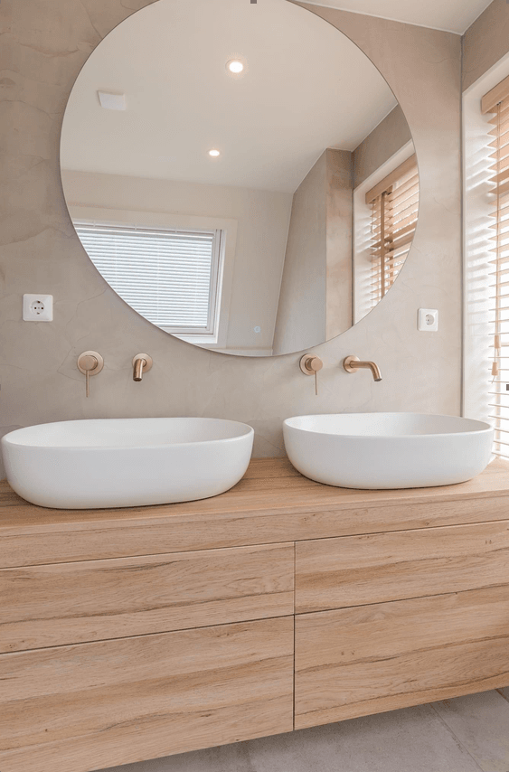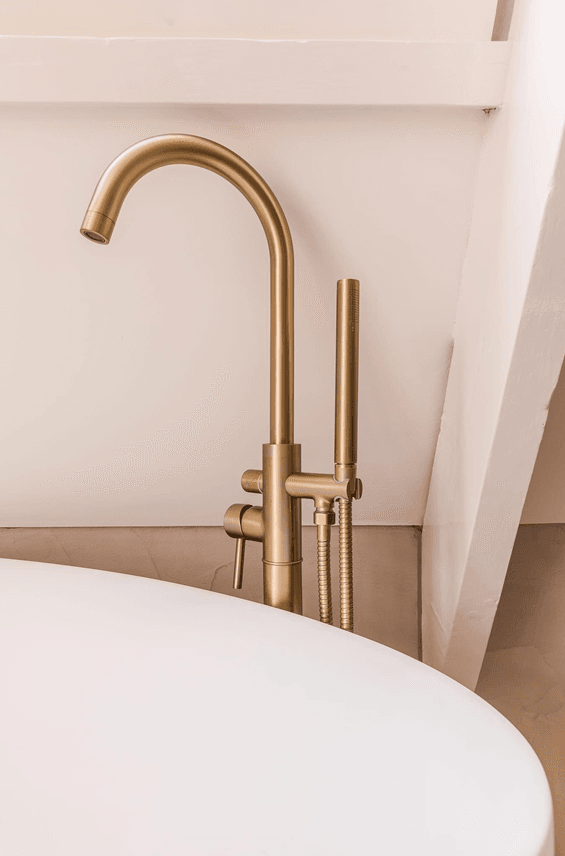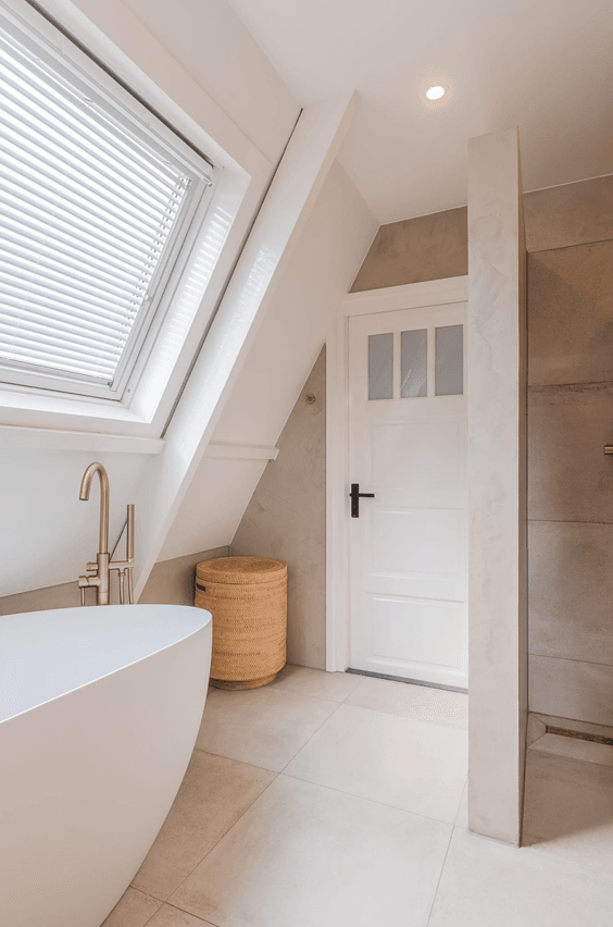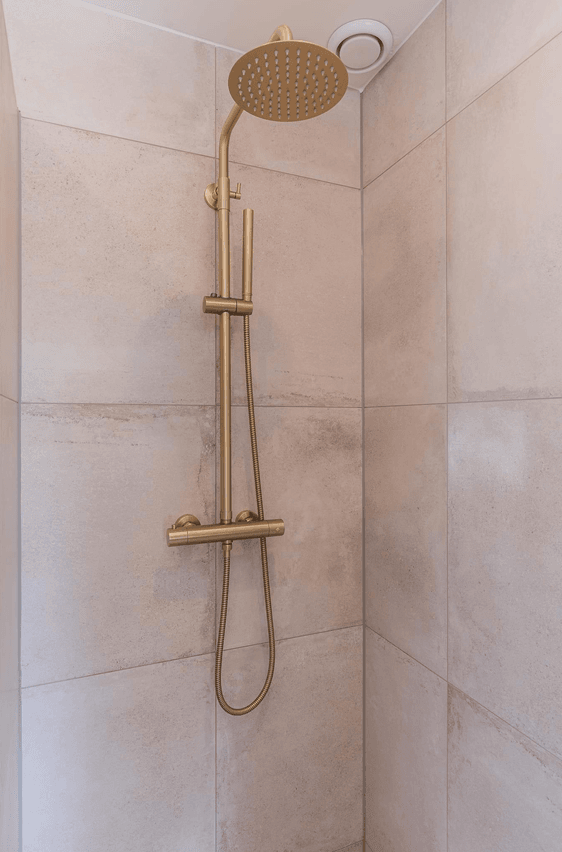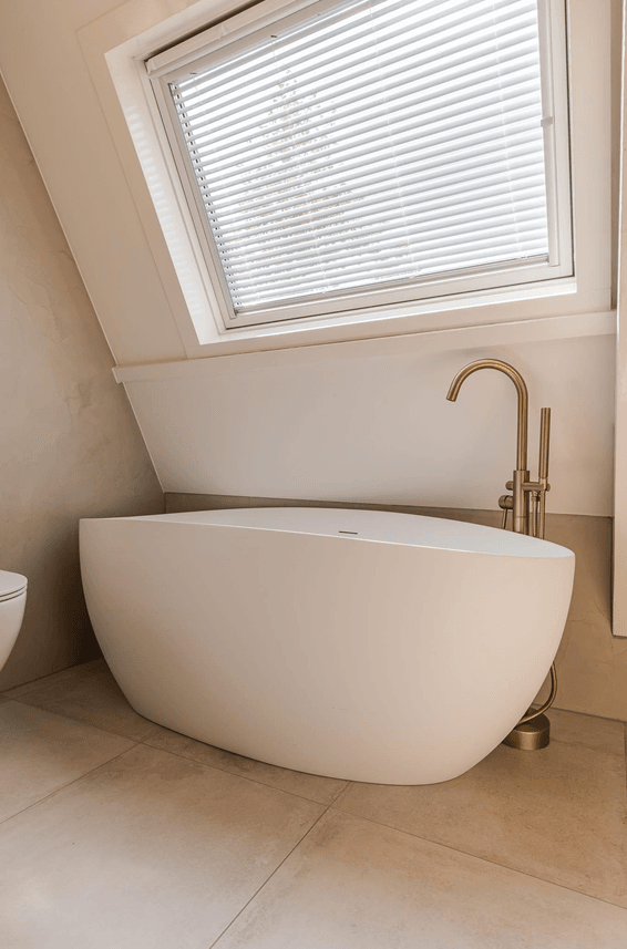 Een prachtige, rustige en frisse badkamer. De slimme indeling en het vele licht zorgen voor een luxe en ruimtelijk gevoel. Het goudkleurige Nancy sanitair maakt het geheel als detail helemaal af.