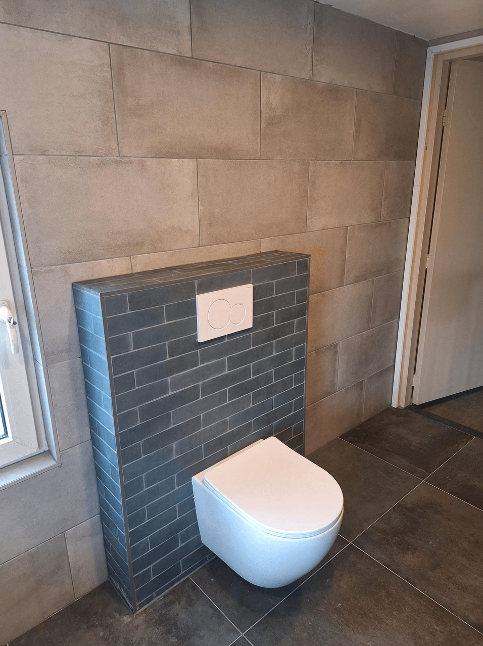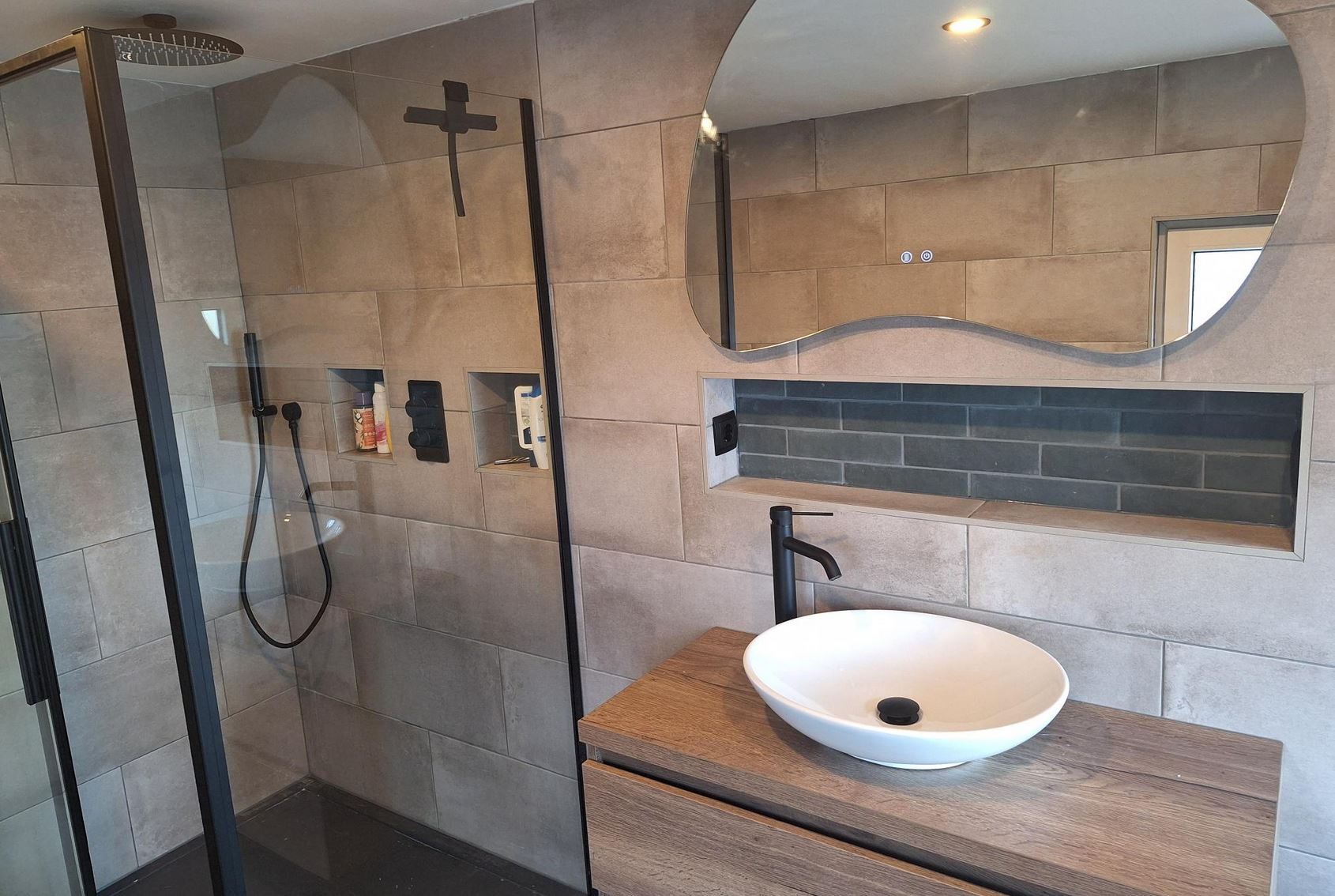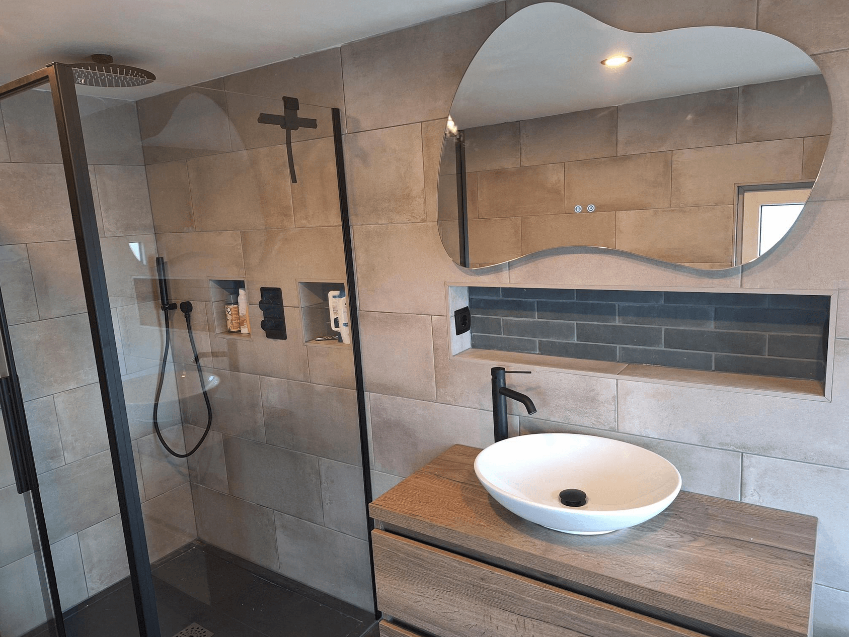 Wat een stoere badkamer is dit geworden. De betonachtige tegels in combinatie met de details in de drie nisjes en rondom het inbouwreservoir zorgen voor een krachtig geheel, samen met de robuuste vloertegel. De hoofddouche uit het plafond en de organische spiegel maken de ruimte helemaal af.