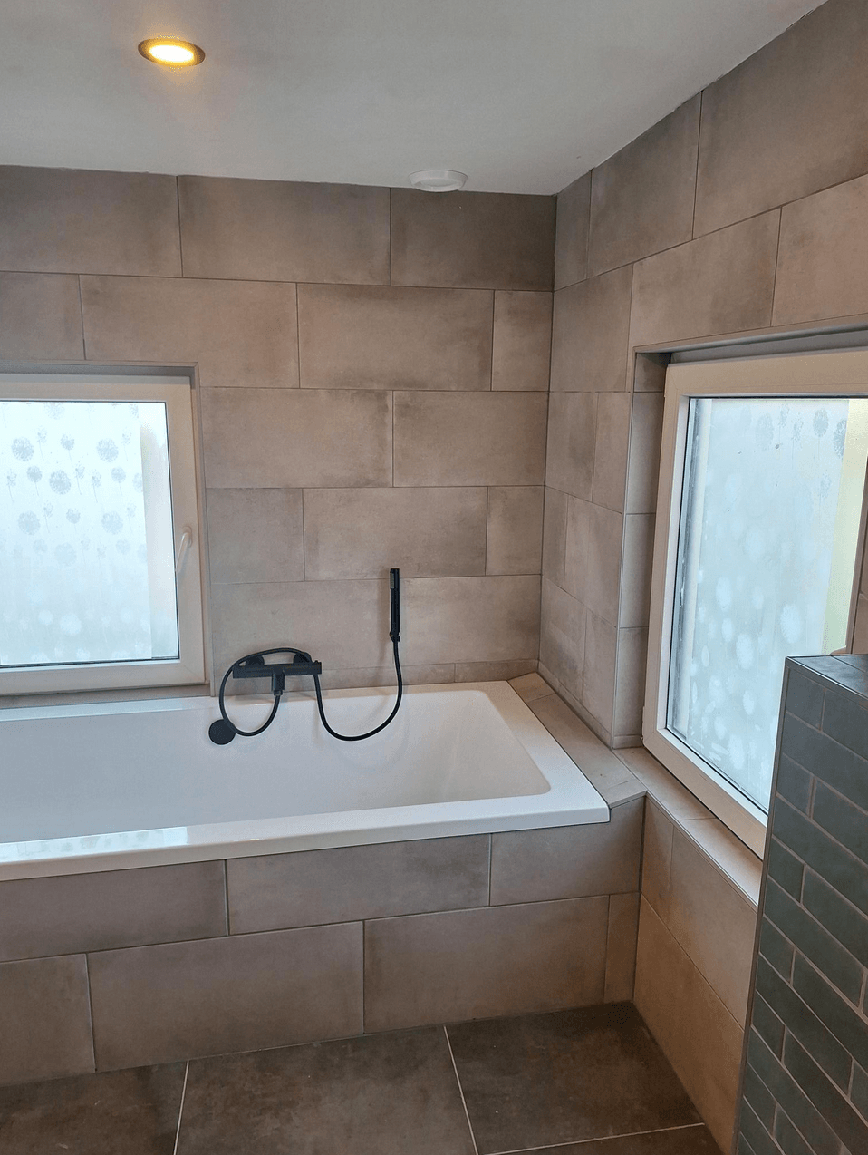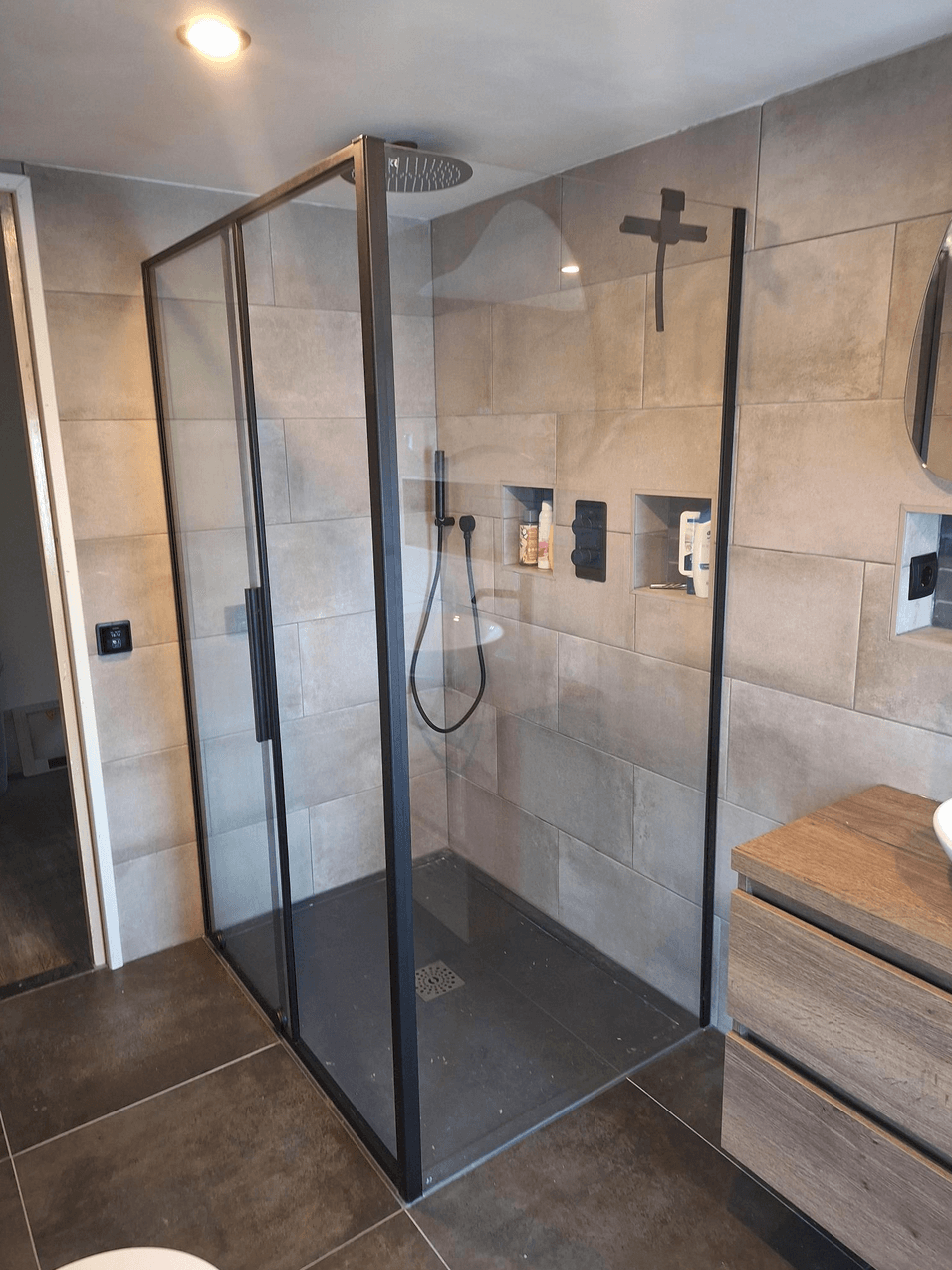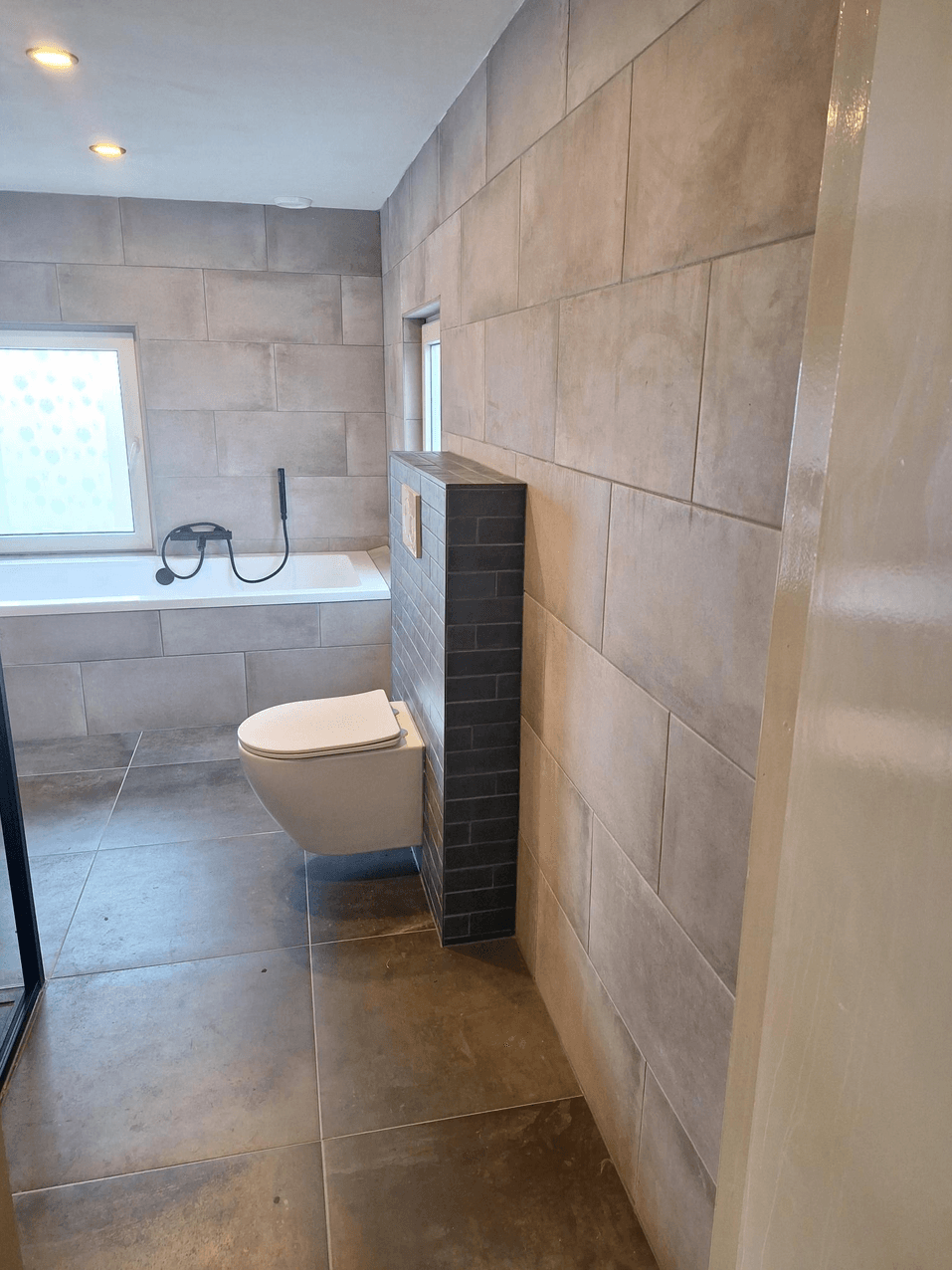 Wat een stoere badkamer is dit geworden. De betonachtige tegels in combinatie met de details in de drie nisjes en rondom het inbouwreservoir zorgen voor een krachtig geheel, samen met de robuuste vloertegel. De hoofddouche uit het plafond en de organische spiegel maken de ruimte helemaal af.