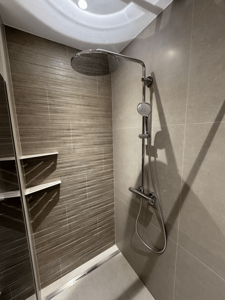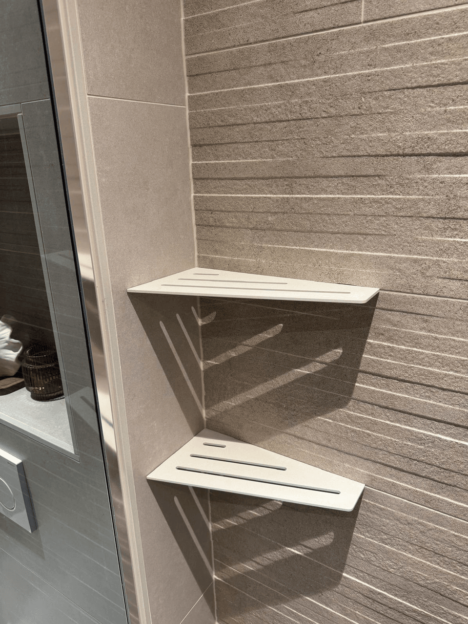 Deze badkamer is ruimtelijk ingedeeld, waardoor er een fijne, open sfeer is ontstaan. De eyecatcher is zonder twijfel de speelse 3D-tegel, die zorgt voor extra diepte en een subtiel reliëf in de ruimte. Dit geeft niet alleen een moderne uitstraling, maar ook nét dat beetje extra karakter.