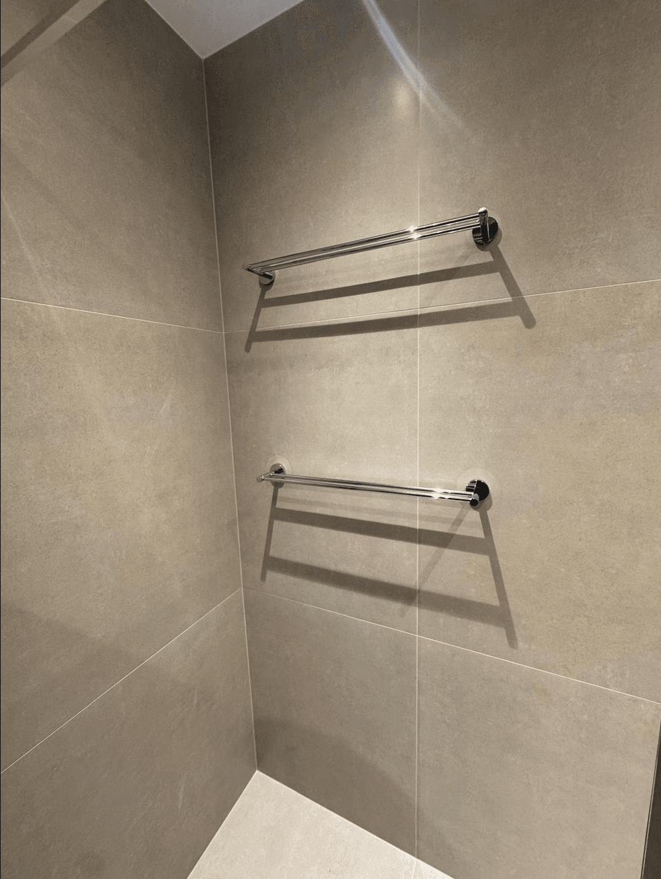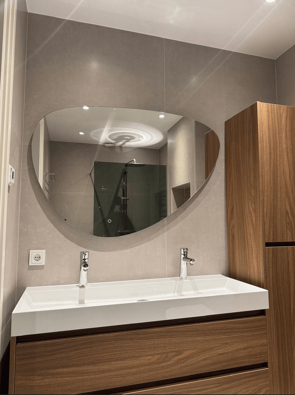 Door de combinatie van strakke lijnen, slimme indeling en bijzondere tegelkeuze is het een stijlvolle en praktische badkamer geworden waar dagelijks van genoten kan worden.