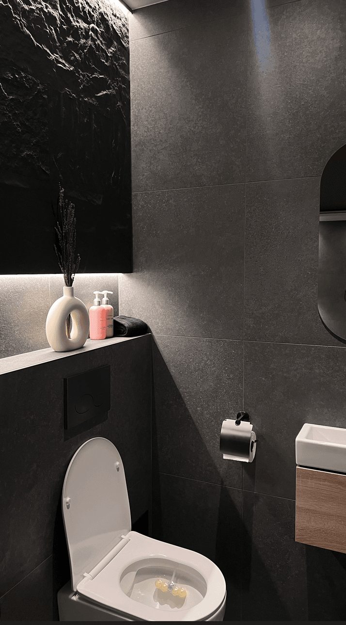 De zwarte keramische rotsblokachtige tegels komen prachtig tot hun recht en geven de ruimte een krachtig en uniek karakter. De LED-strips erboven zorgen voor een bijzonder schaduweffect, waardoor de structuur van de tegels nóg beter zichtbaar wordt.