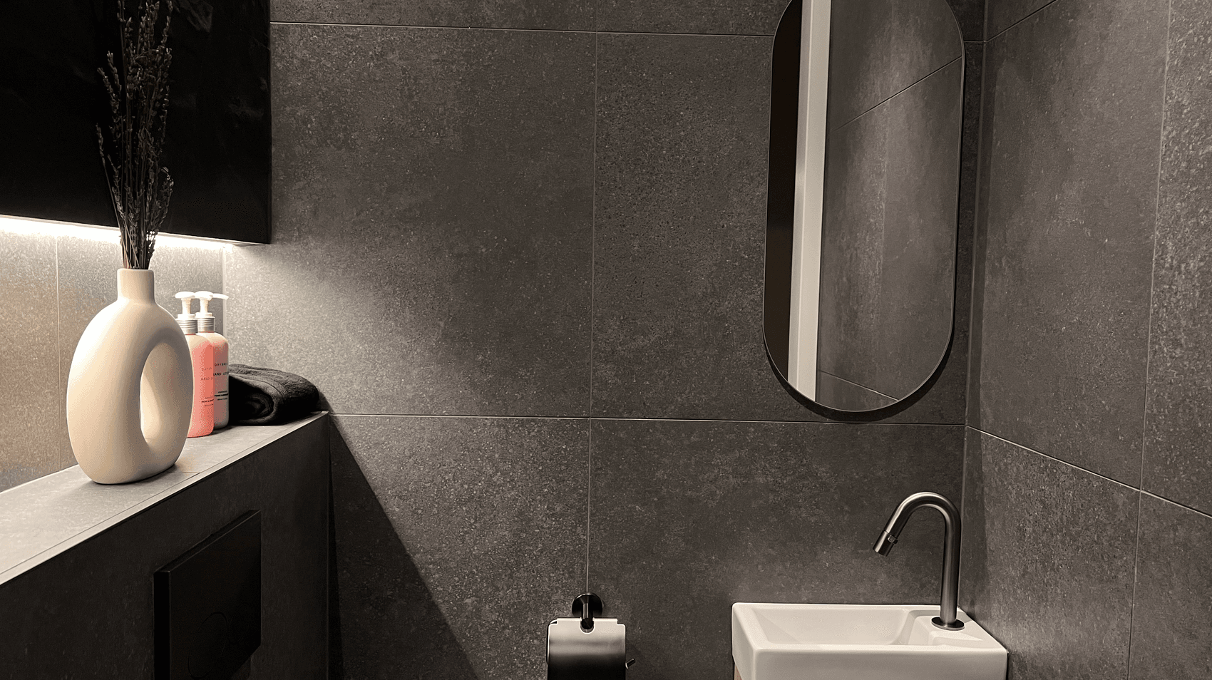 Wat een stoere, robuuste en donkere toiletruimte is dit geworden!
