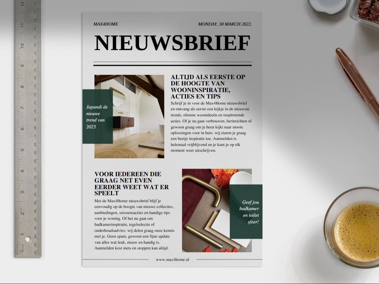 Wat leuk dat je interesse hebt in onze nieuwsbrief! We delen graag met je de nieuwste woontrends, leuke acties en handige tips voor in en om het huis. Aanmelden is helemaal vrijblijvend en je kunt je op elk moment weer eenvoudig uitschrijven. We hopen je binnenkort te mogen inspireren!